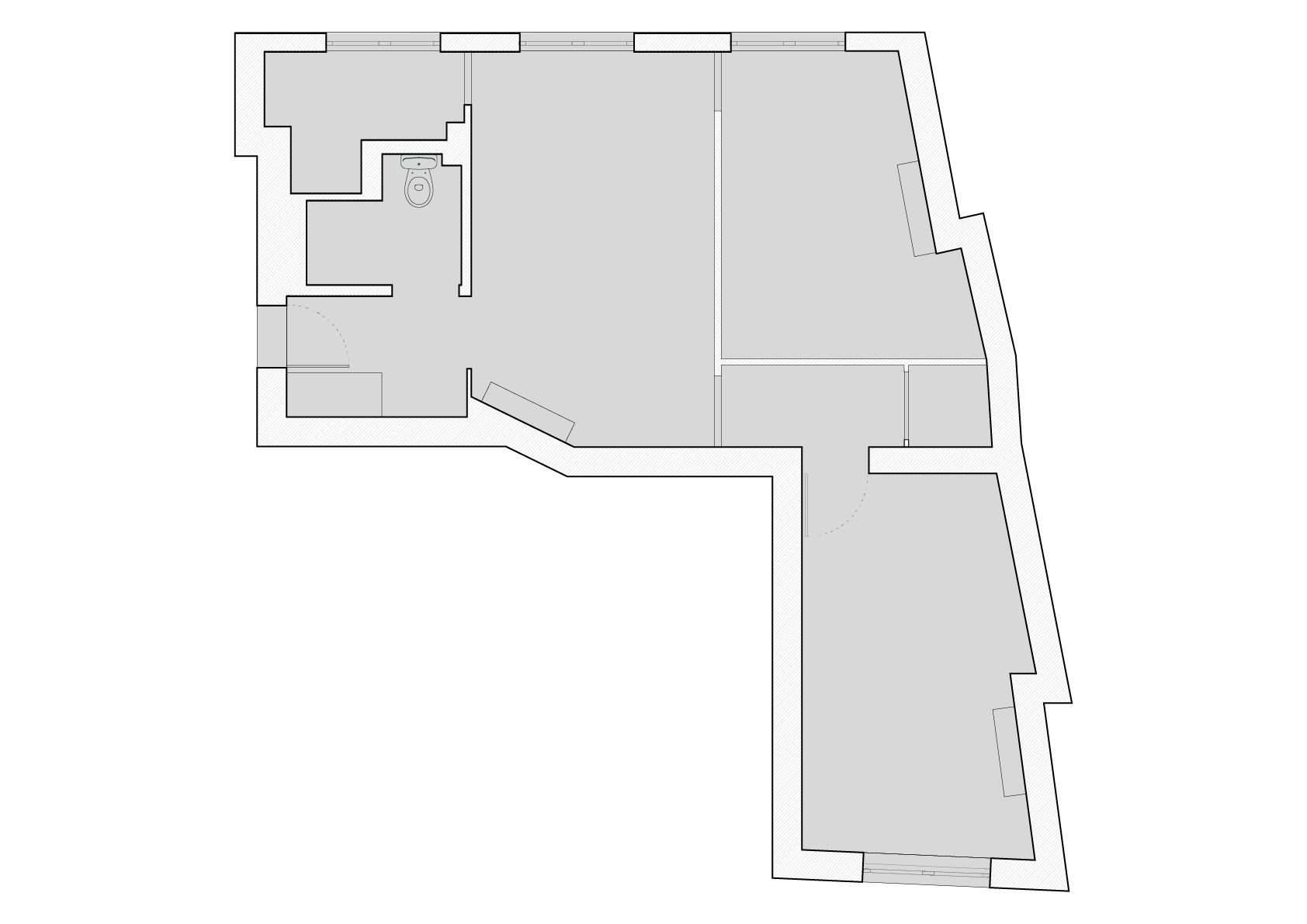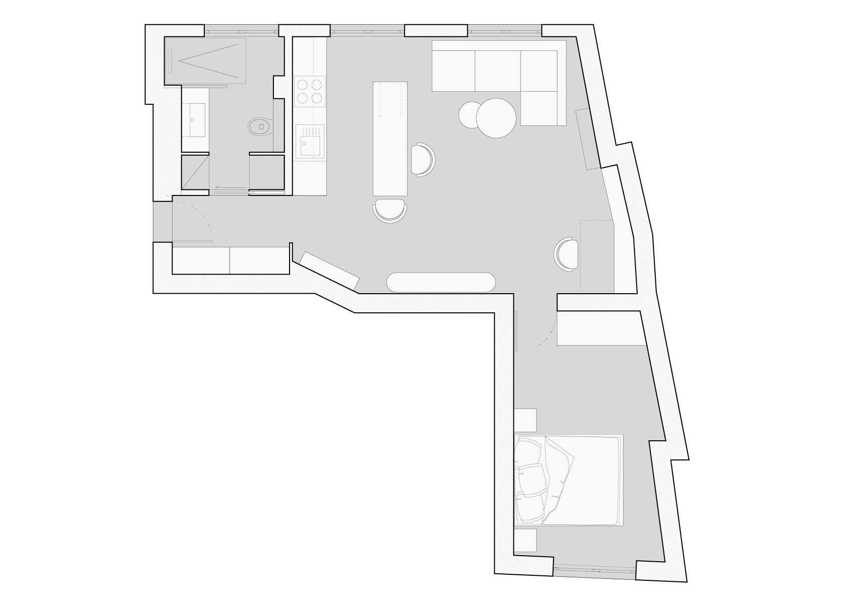 Surface 42 m² Cet appartement, traversant situé dans un immeuble datant des années 1900, à été complètement transformé. L'objectif de la rénovation a été de réunir trois pièces en deux pièces pour offrir aux occupants un Volume spacieux et lumineux. La cuisine, inexistante à l’origine prend place dans le volume principal de l'appartement. Elle apparait comme un bloc monochrome et minimaliste, Disparaissant dans l'espace de vie. L'ensemble des fonctions y sont intégrées et optimisées, sans superflu.